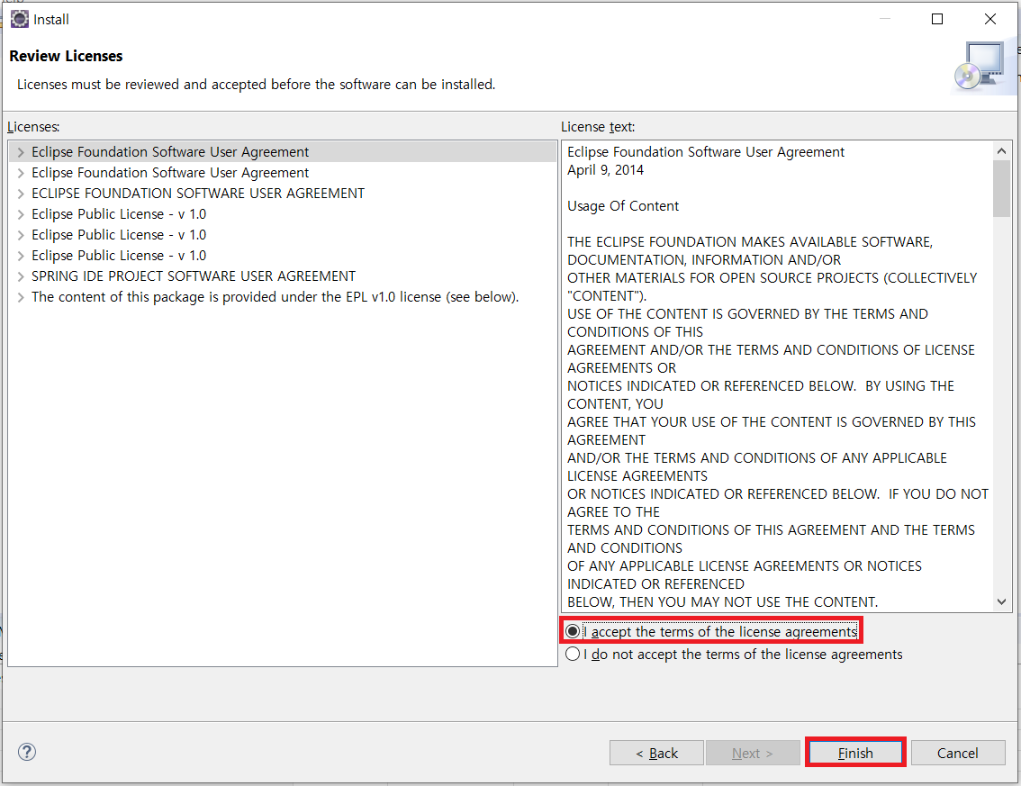 6. I accept the terms of the license agreements 클릭 후 Finish 클릭